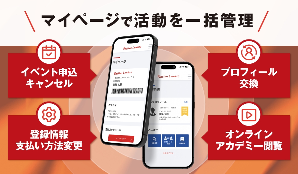 登録情報やお支払い方法の変更、イベントの申込・キャンセル、参加者の確認など、あらゆる手続きがマイページからスムーズに。会員特典・オンラインアカデミー・会員プロフィールもここからアクセス可能です。さらに、お支払い状況の確認や領収書発行、よくある質問・お問い合わせもすべて集約。活動の中心として、あなたの挑戦を支えるプラットフォームです。